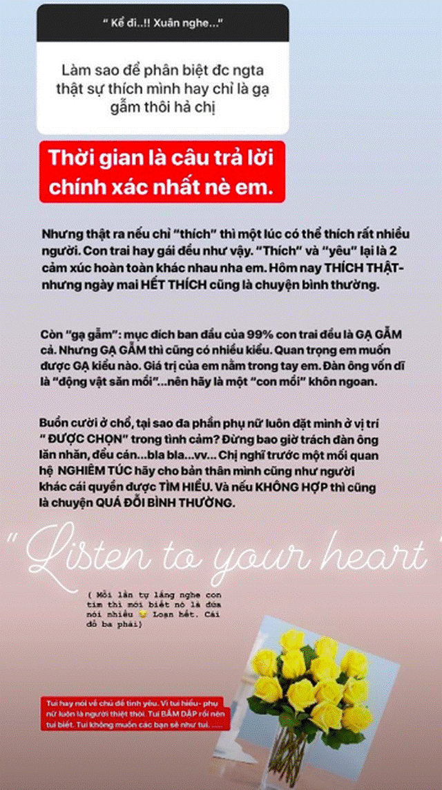 Chẳng những vậy, Xuân còn nhận cả nhiệm vụ lắng nghe và tư vấn tình cảm cho fan. Mới đây, một fan gửi tới Xuân câu hỏi: "Làm sao để phân biệt được người ta thật sự thích mình hay chỉ là gạ gẫm?", Xuân đã tâm sự rất nhiều cùng fan này.