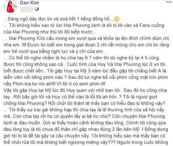 Đan Kim chia sẻ thêm: "Mai Phương! Chị cầu mong em vượt qua và khỏe lại lên đính chính dùm chị nha em! Được tin biết em trong giai đoạn 2 chị rất mừng cho em chị tin rằng em sẽ vượt qua bằng nghị lực và ý chí của em.