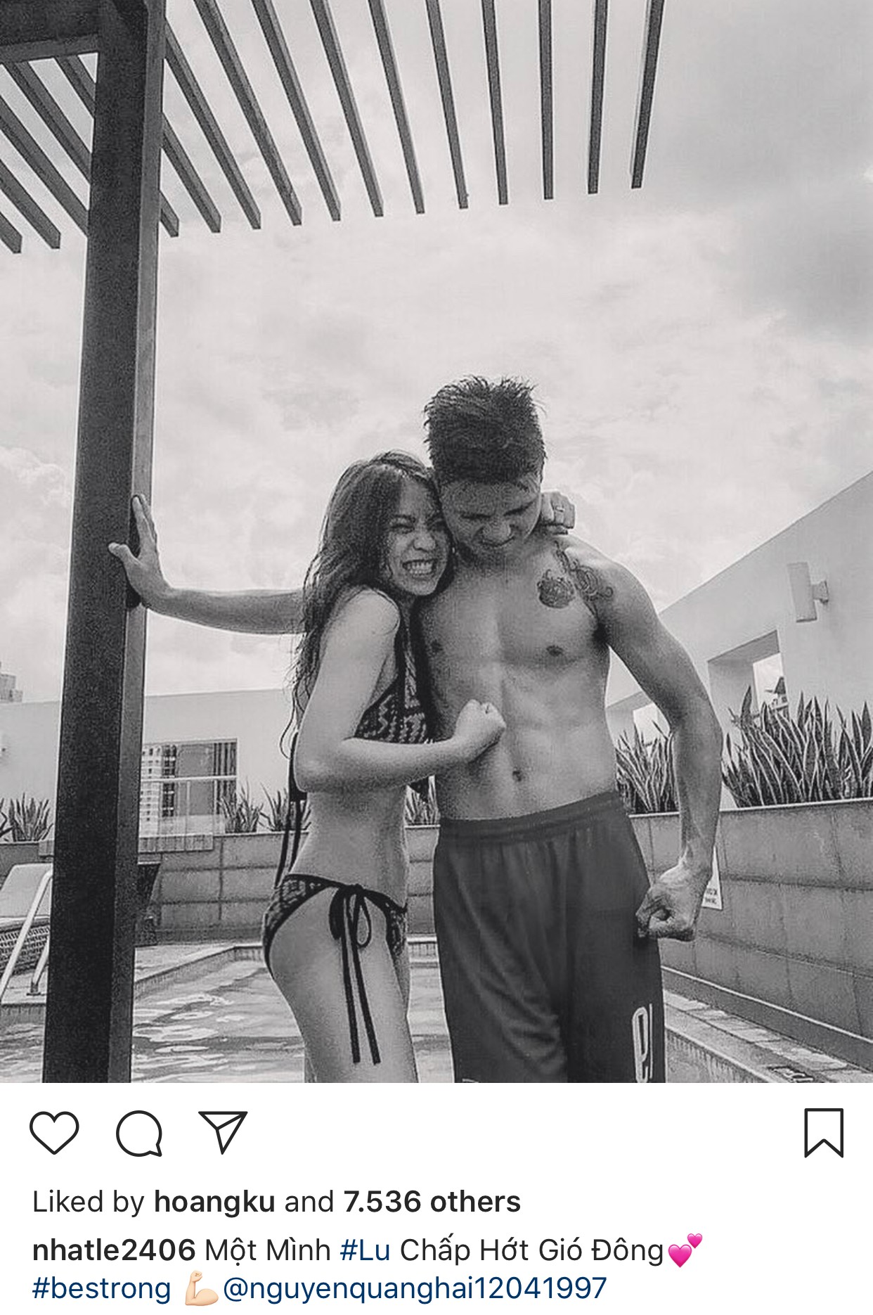 Mới đây, Nhật Lê - bạn gái cầu thủ Quang Hải đã đăng tấm ảnh mình và bạn trai thân thiết lên Instagram cá nhân với caption ngụ ý sẽ sát cánh cùng anh đi qua mọi cơn bão, dù đó là bão hâm mộ cuồng nhiệt hay những ý kiến chủ quan ích kỷ gây tổn thương Quang Hải.