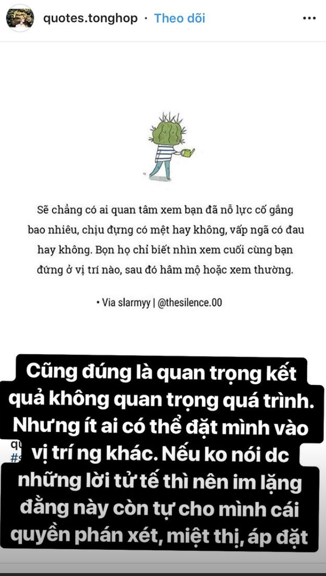 Tuy nhiên, trong story trên Instagram của mình Nhật Lê còn có một chia sẻ gây chú ý hơn. Trích lại một câu quote định nghĩa về thành công - lòng hâm mộ, Nhật Lê đưa ra ý kiến cá nhân: "Cũng đúng là kết quả quan trọng, không quan trọng quá trình. Nhưng ít ai có thể đặt mình vào vị trí của người khác. Nếu không nói được những lời tử tế thì nên im lặng đằng này còn tự cho mình cái quyền phán xét, áp đặt, miệt thị".