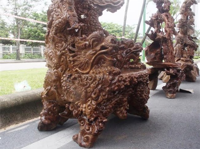 Bộ bàn lũa từ gỗ gù hương được chạm trổ tinh xảo rồng cuốn hổ ngồi khiến khách xem hết sức trầm trồ. Chủ nhân của nó là một người trẻ tuổi ở Chiêm Hóa, Tuyên Quang.