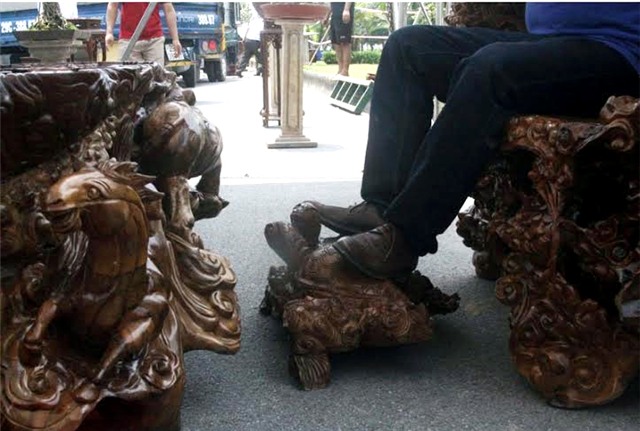 bộ bàn ghế “ngũ long”, chiếc bàn gù hương nguyên khối có kích thước