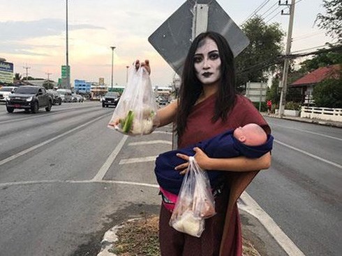 Khi thấy tình hình buôn bán quá ế ẩm, cô gái trẻ đã quyết định hóa trang thành một hồn ma nổi tiếng ở Thái Lan để đứng bán hàng trên đường cao tốc.