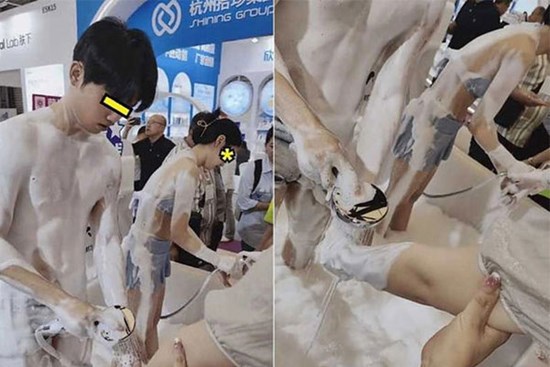 Các nhân viên bán hàng tại một trung tâm mua sắm ở Trùng Khánh đã không ngần ngại đứng tắm trước mặt khách để chứng minh chất lượng sản phẩm.