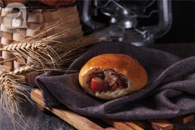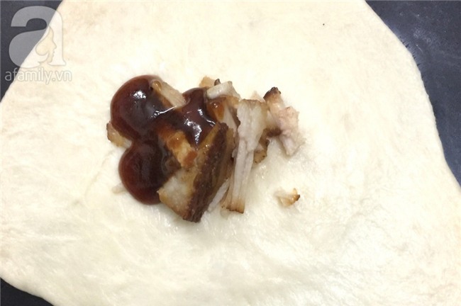 Dùng cán để cán dẹp khối bột đã chia, phần viền mỏng hơn phần giữa của bột. Cho nhân thịt đã kho và nước thịt đã làm sệt vào giữa khối bột, túm viền bột vê lại tạo hình tròn. Pha phần trứng còn lại với chút xíu sữa tươi, dùng cọ phết lên mặt bột bánh.