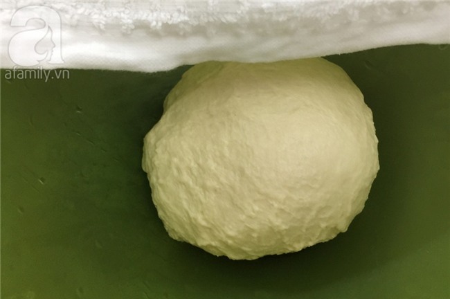 Tạo khối tròn cho bột rồi cho vào âu, dùng khăn ẩm đậy mặt, ủ bột 45-50 phút. Trong lúc ủ bột, chuẩn bị nhân thịt kho.