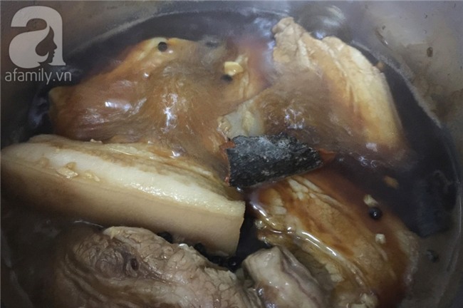 Khi thịt chín lấy 1 lượng nước thịt vừa đủ, pha 8gr bột năng với nước sạch, giảm lửa nhỏ và từ từ cho bột vào nước thịt quấy đều từ đáy nồi lên để tránh bị dính đáy.