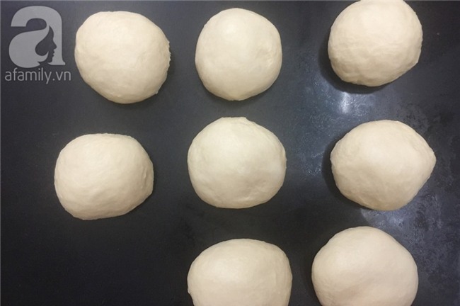 Dùng ngón tay thử độ nở của bột, ấn sâu vào bột không phồng lên lại nghĩa là đạt. Dùng cân để chia khối bột thành 10 phần đều nhau. Vê tròn.