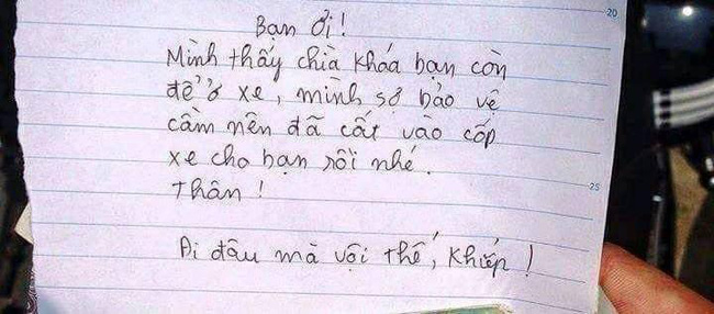Cậu nam sinh này đã rút khóa, thả vào cốp rồi đóng lại. Sau đó, cậu bạn này còn cẩn thận viết một mẩu giấy nhắn. Nội dung bức thư rất dễ thương: "Bạn ơi! Mình thấy chìa khóa bạn còn để ở xe, mình sợ bảo vệ cầm nên đã cất vào cốp xe cho bạn rồi nhé. Thân! Đi đâu mà vội thế, khiếp!"
