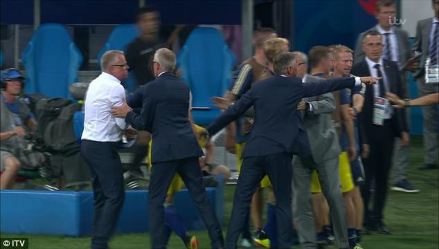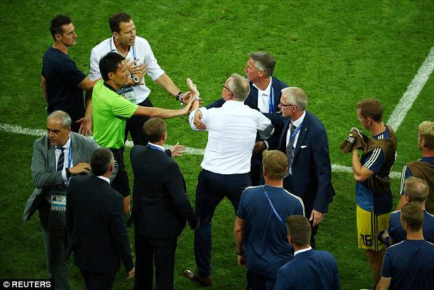 Sau bàn thắng "quý như vàng" của Toni Kroos vào phút cuối cùng của trận đấu, Ban huấn luyện 2 đội tuyển Đức và Thụy Điển đã lao vào cãi vã nhau ngay ngoài đường pitch.