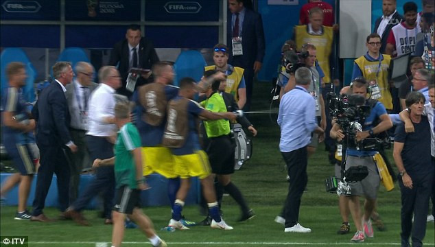Cầu thủ dự bị Martin Olsson thậm chí còn xịt nước vào thành viên của đội tuyển Đức.