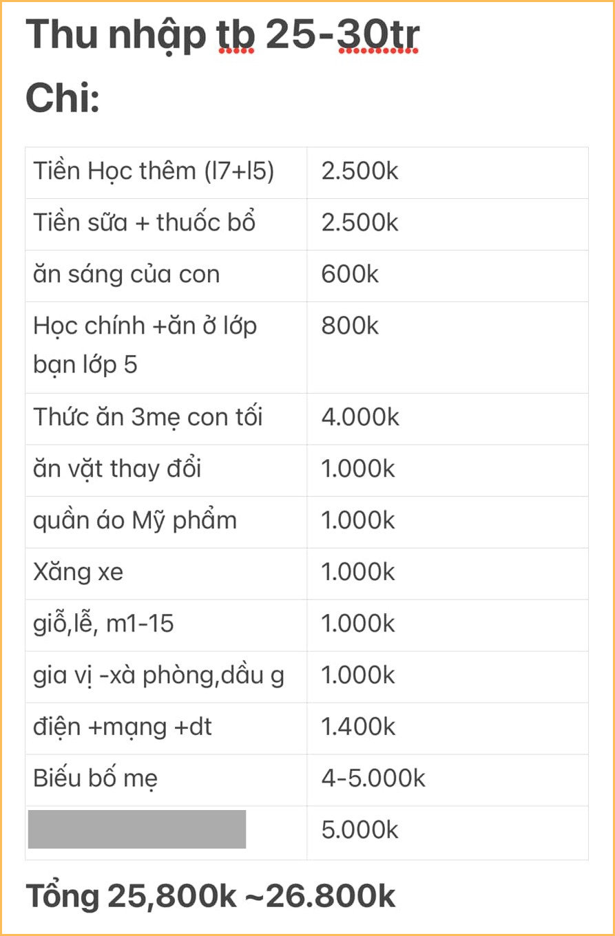 Nhìn vào bảng chi tiêu này, có thể thấy số tiền mà cô chi cho việc học của 2 con cũng như tiền sinh hoạt, ăn uống của cả 3 mẹ con rơi vào khoảng 16,8 triệu đồng. Còn lại đều là tiền tiết kiệm, tiền biếu bố mẹ.