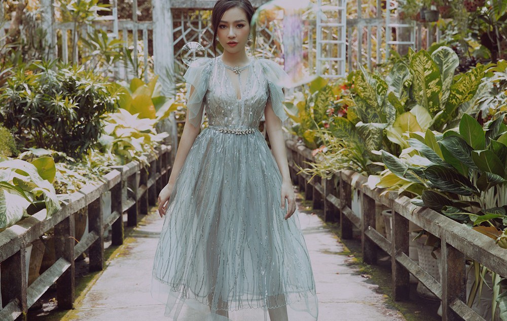 Băng Di trông như một nàng thơ kiêu kỳ, quyến rũ khi diện thiết kế xuyên thấu, bồng bềnh với hàng nghìn hạt cườm lấp lánh được đính kết trên phần lưới dập li.