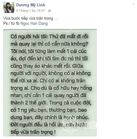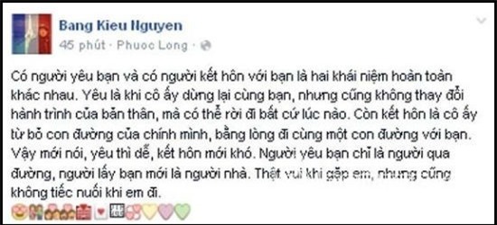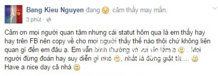 Tuy nhiên vào ngày hôm qua (13/1), Bằng Kiều đã chia sẻ một status đầy ẩn ý khiến mọi người nghi ngờ mối quan hệ của anh và Dương Mỹ Linh đang có vấn đề.