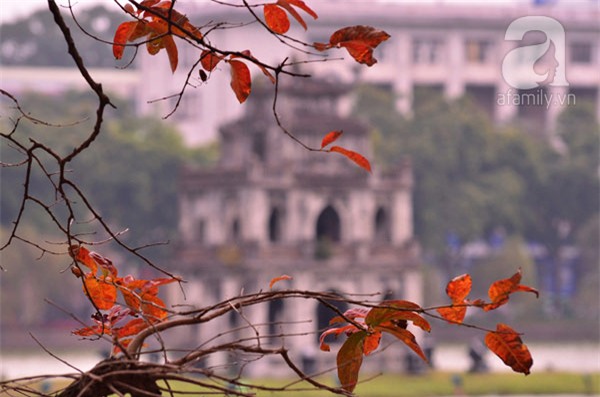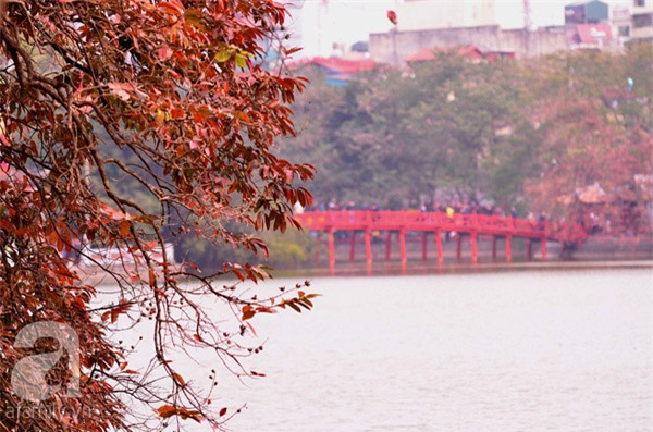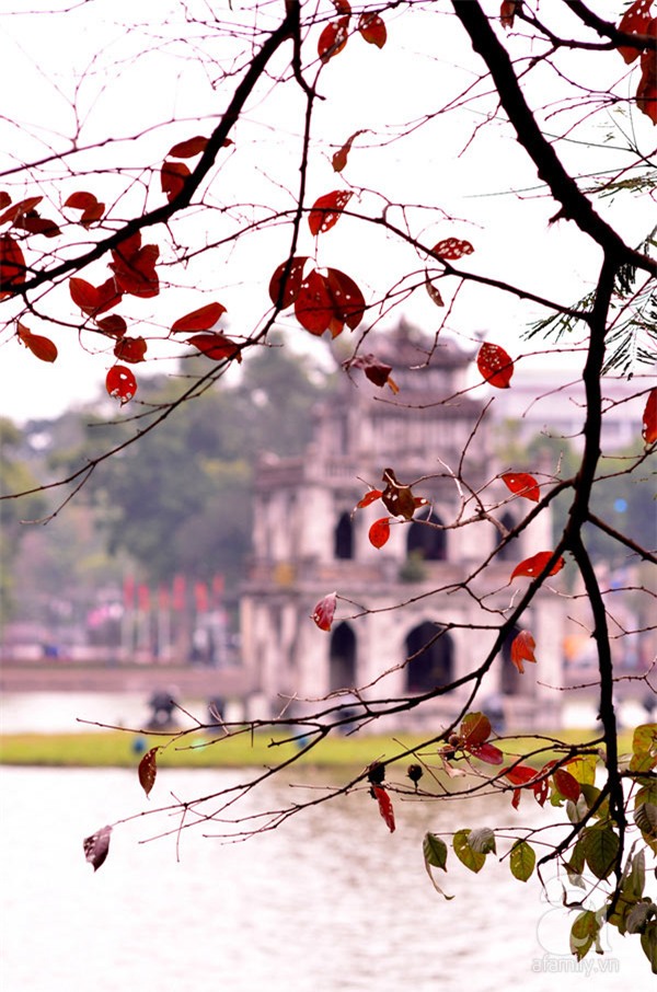 Những tán lá đỏ bên Tháp rùa như một bức tranh đầu xuân lộng lẫy.