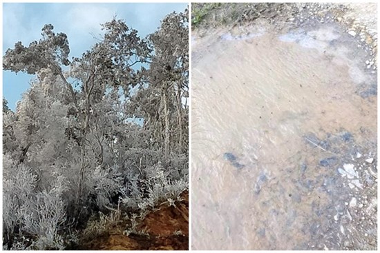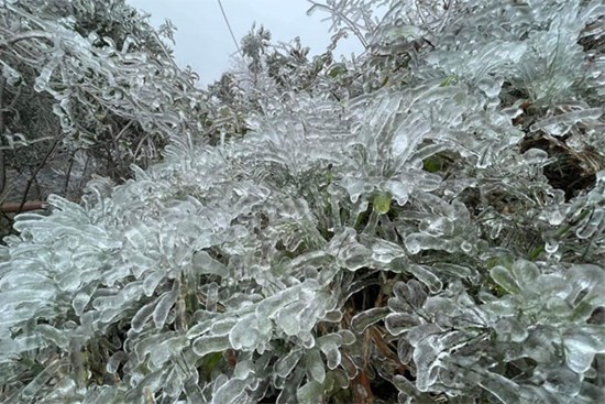 Ảnh hưởng của không khí lạnh tăng cường, nhiệt độ xuống dưới 0 độ C đã làm cho nước đóng băng trên cây cối ở nhiều nơi tại huyện Kỳ Sơn, tỉnh Nghệ An.
