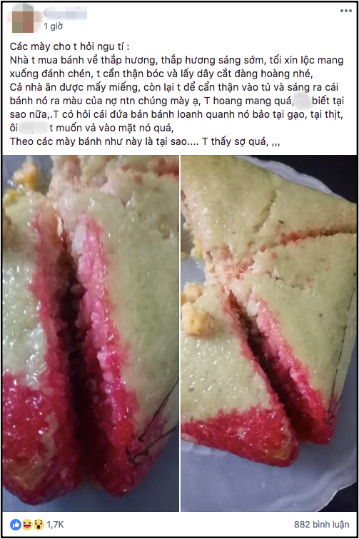 Chiếc bánh chưng xuất hiện những vệt màu đỏ khiến người xem kinh hãi.