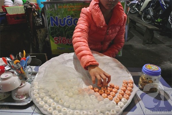 Bát bánh múc ra, cô bán hàng thấy tôi cứ loay hoay chụp ảnh bát bánh thì buồn cười lắm, liên tục giục tôi ăn ngay cho nóng. Trời ơi, làm sao tôi có thể nỡ ăn ngay khi bát bánh đẹp thế này mà chưa làm qua thủ tục "check in". Ngụp lặn trong làn nước đường nâu thơm mùi gừng là những viên bánh màu cam và trắng đã được luộc chín, thơm phức, đầy mời gọi.