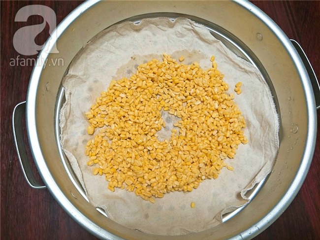 Đậu xanh vo sạch sẽ rồi ngâm nước 2-3 tiếng cho nở mềm, cho đậu xanh vào xửng hấp chín.