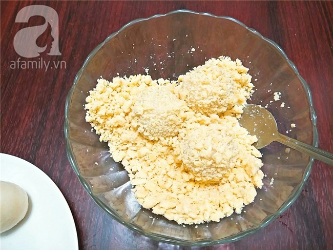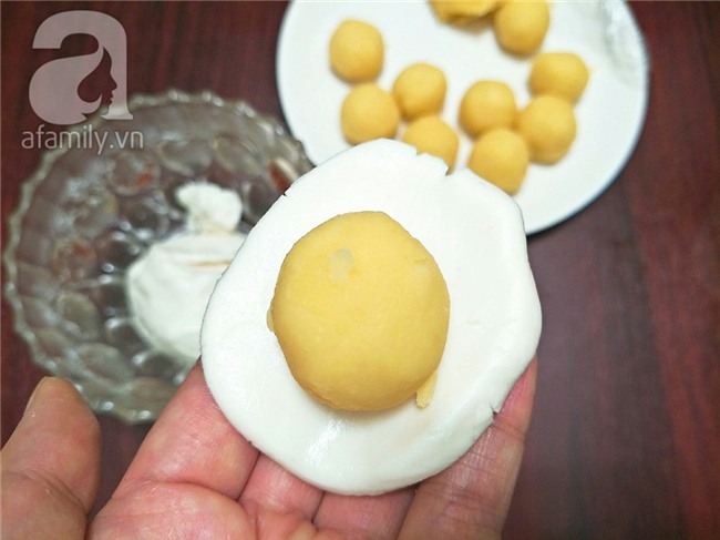 Sau 15 phút, bạn lấy khối bột ra và chia đều thành các viên đều nhau, ấn dẹt miếng bột rồi cho viên nhân đậu xanh vào giữa, gói lại sao cho tròn đều và nhân không bị hở ra ngoài, bạn làm như vậy cho hết nguyên liệu còn lại.