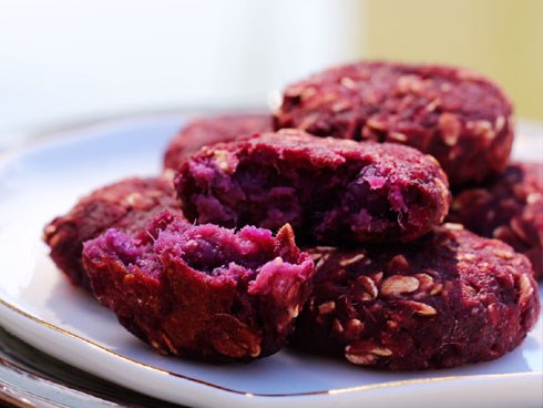 Từng chiếc bánh khoai chuối nhỏ xinh với sắc tím đẹp mắt, khi ăn vừa bùi lại ngọt thanh vị chuối và mật ong rất ngon miệng.