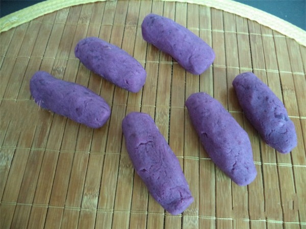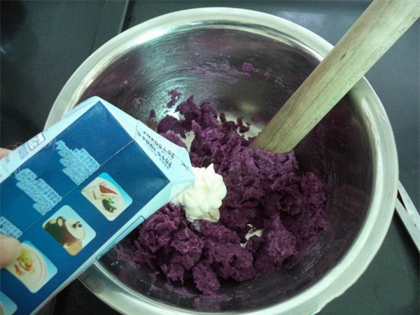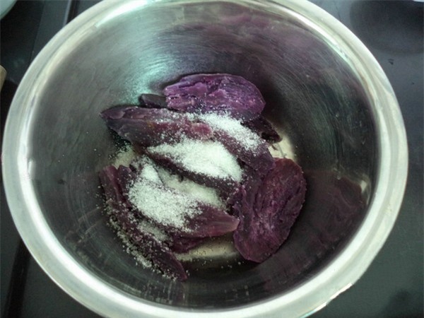 Khoai lang gọt vỏ rồi hấp chín. Cho khoai lang vào âu, thêm đường vào rồi giã nhuyễn.