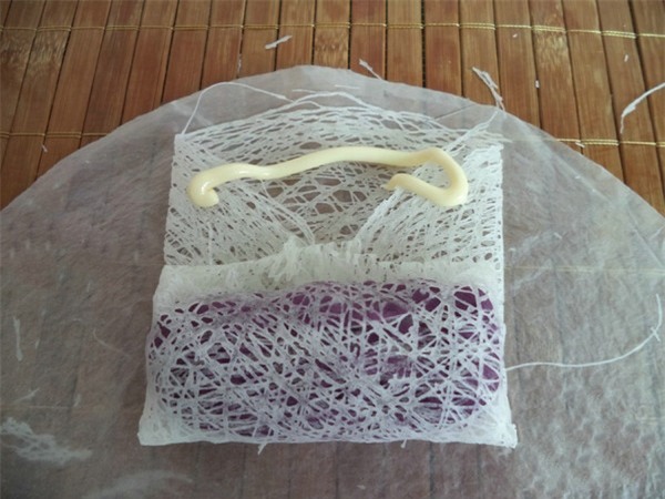 Trải bánh tráng rế ra thớt, cho từng viên khoai lên trên rồi cuộn lại như cuộn nem rán. Cuối cùng để cố định mép bánh bạn thêm chút sốt mayonnaise vào rồi cuốn lại. Làm tương tự với phần khoai còn lại.