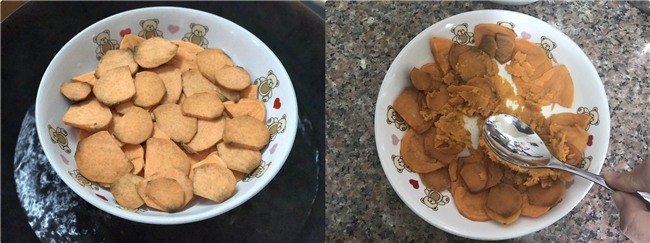 Khoai lang gọt vỏ rửa sạch thái lát rồi cho vào nồi hấp chín sau đó nghiền nát khoai lang.