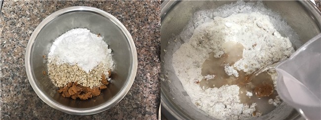 Cho khoai lang nghiền vào âu, thêm yến mạch, bột nếp, đường vào. Đổ từ từ 50ml nước vào âu bột.
