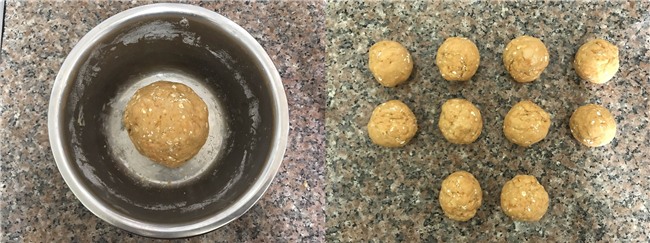 Nhào bột thành khối dẻo mịn. Chia bột thành từng viên nhỏ, mỗi viên khoảng 50g.