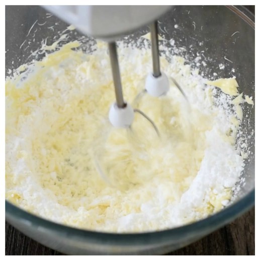 Cho bơ và đường bột vào tô, dùng máy đánh trứng đánh cho tới khi bơ chuyển màu sáng.
