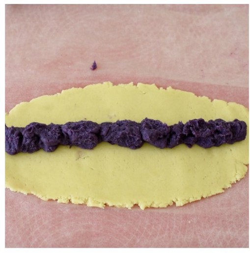 Chia bột làm 5 phần. Bọc kín các phần bột chưa làm lại để bột không bị khô. Dùng cây cán bột cán mỏng khối bột vừa nhào. Sau đó múc nhân khoai lang vào giữa. Sau đó cuộn tròn lại sao cho phần bột kín phần nhân.