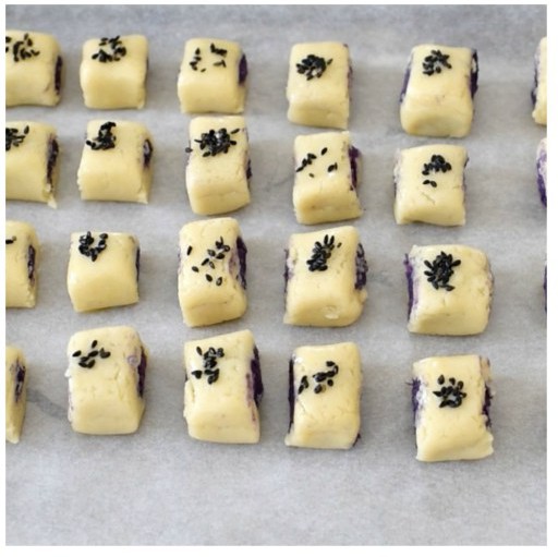Chuẩn bị sẵn một khay nướng có lót sẵn giấy nến. Cắt cuộn bột thành từng viên bánh có chiều rộng khoảng 2cm. Sau đó phết 1 lớp mỏng trứng đã đánh tan lên mặt bánh rồi rắc chút vừng đen lên trên. Xếp bánh lên khay.