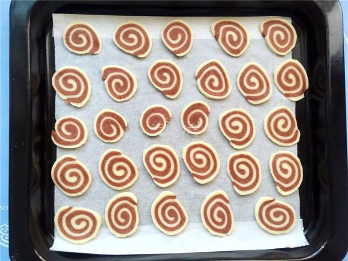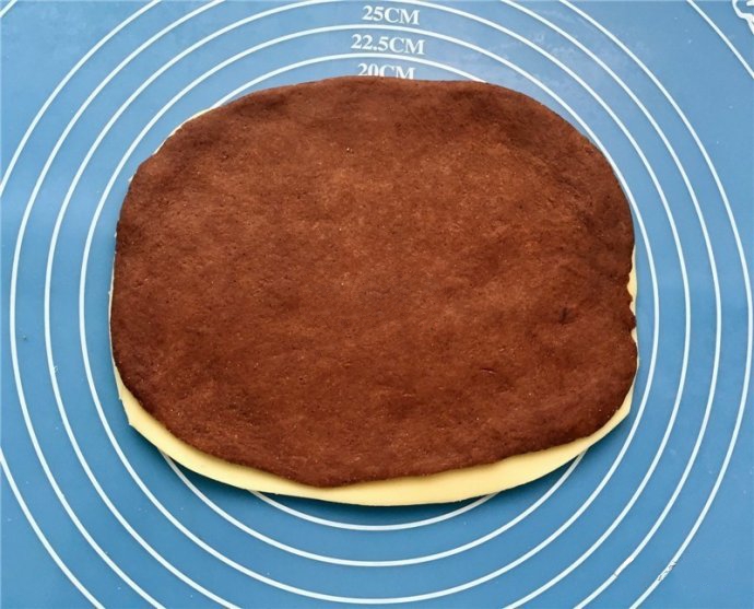Bước 4: Cán mỏng từng khối bột sau đó đặt tấm bột chứa ca cao lên trên tấm bột còn lại. Nếu hai tấm bột không dính vào nhau bạn có thể dùng bình xịt rồi xịt ít nước lên trên tấm bột màu trắng rồi đặt tấm bột màu nâu lên trên.