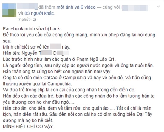 Những đứa trẻ trong clip là con cái của công nhân trong đồn điền đó. Hắn tiếp cận các đứa trẻ, bản thân các công nhân đó họ lầm tưởng hắn ta yêu thương con họ chứ đâu ngờ. Hắn cho ăn, cho tiền, đem về tắm rửa, cho quần áo. Tất cả chỉ là màn kịch".