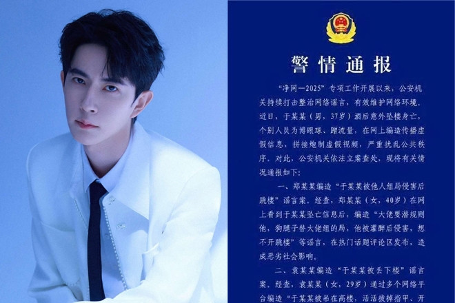 Nam diễn viên Vu Mông Lung 37 tuổi, qua đời ngày 11/9 sau khi rơi từ trên cao. Cảnh sát Trung Quốc thông báo đã loại trừ yếu tố hình sự trong vụ việc và xác định không có hành vi phạm tội.