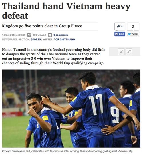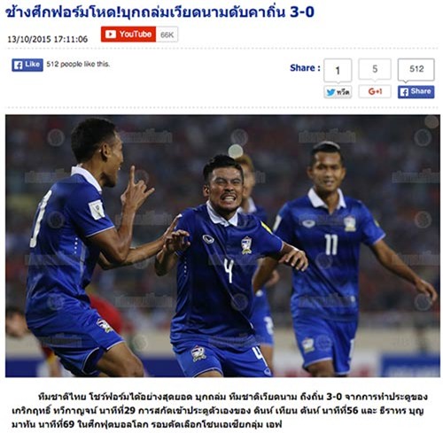 Trong khi đó tờ báo thể thao SiamSport giật tít: 'Những chú Voi đã thực hiện một cuộc tấn công mạnh mẽ trước ĐT Việt Nam'.