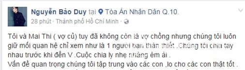 Trước thông tin đó, Bảo Duy lên tiếng: “Tôi và Mai Thi (vợ cũ) tuy đã không còn là vợ chồng nhưng chúng tôi luôn giữ mối quan hệ chỉ xem như là 1 người bạn thân thiết. Chúng tôi chia tay nhau trước khi đến Vân. Cuộc chia ly nhẹ nhàng êm ái. Vấn đề quan trọng chúng tôi tập trung vào các con, lo cho các con thật tốt”.