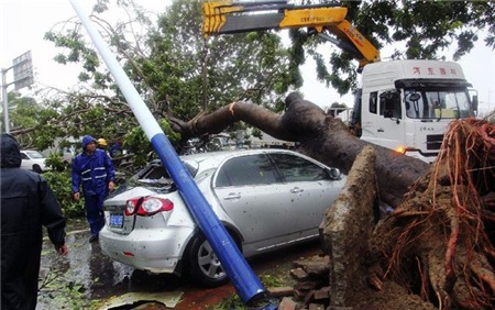 Nhiều ô tô hư hại do cây đổ trong bão. Ảnh: hinews.cn.