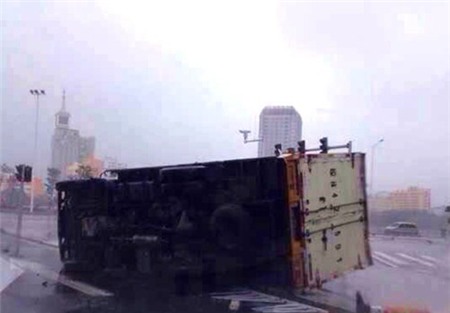 Gió làm lật một xe tải khi nó đang lưu thông trên đường. Ảnh: hinews.cn.
