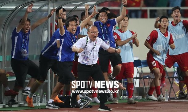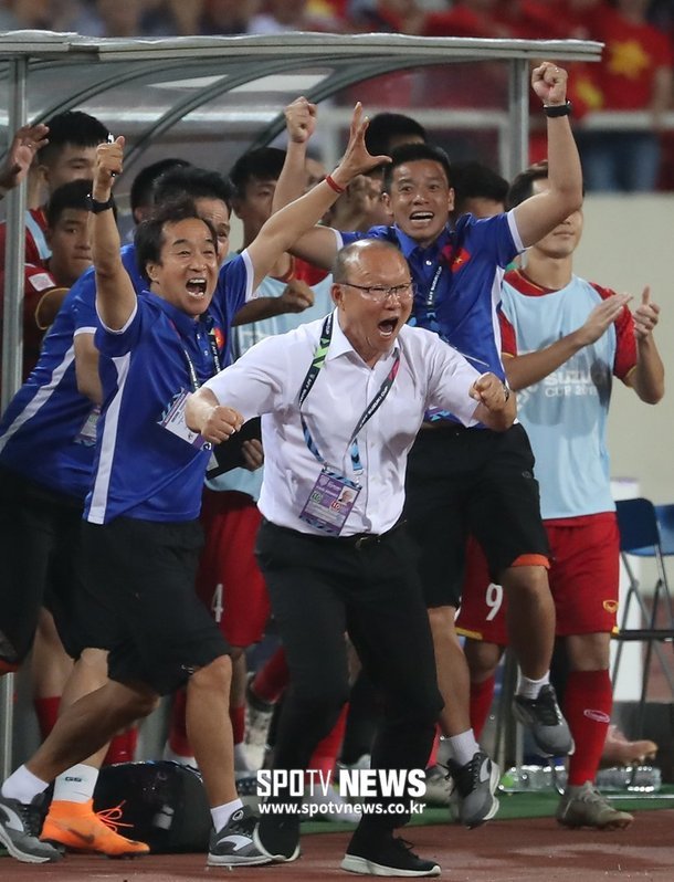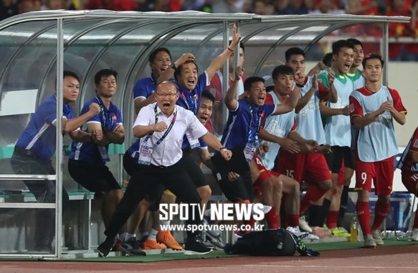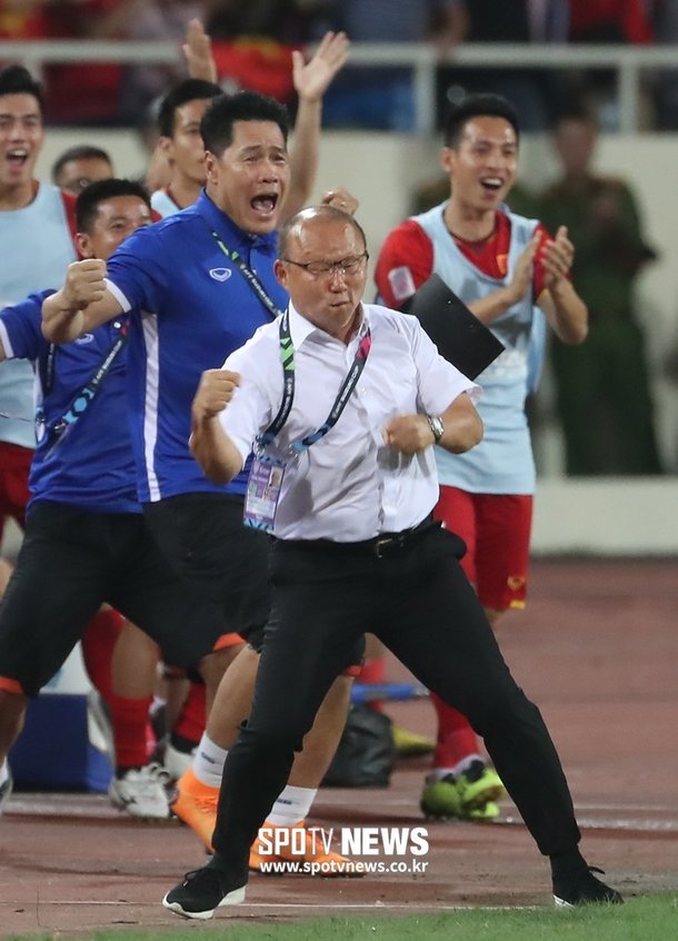 Phóng viên của tờ Spotvnews tác nghiệp tại sân Mỹ Đình, cập nhật nóng hình ảnh HLV Park Hang Seo "bay" bên ngoài sân khi Công Phượng xé lưới tuyển Malaysia, đưa tuyển Việt Nam dẫn trước 1-0, bảng A AFF Cup 2018.