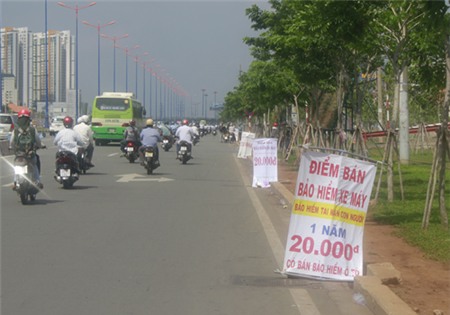 Dày đặc nhất là dọc Xa Lộ Hà Nội và khu vực trung tâm quận Thủ Đức. Giá bán một năm 35.000 đồng, hai năm 66.000 đồng - rẻ gần một nửa so với mức thông thường. Có nhiều điểm còn trưng bảng giảm 40-50%, mua 1 tặng 1. Trong số các biển quảng cáo ven đường, nổi bật là bảo hiểm tự nguyện cho người ngồi sau xe 20.000 đồng in to, bắt mắt, mà mới nhìn qua, người đi đường dễ hiểu là bảo hiểm xe máy chỉ 20.000 đồng.