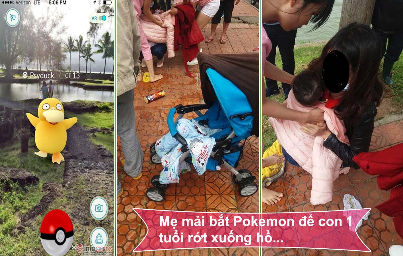 Điển hình là vụ việc một người mẹ trẻ ở TP Đà Lạt (Lâm Đồng) đã mải mê bắt Pokemon để con 1 tuổi rớt xuống hồ Xuân Hương suýt mất mạng. Rất may, ngay lúc này một vị khách nước ngoài cùng một số người dân đang làm việc sát đó đã nhanh chóng nhảy xuống hồ vớt cháu bé và chiếc xe đẩy lên bờ.