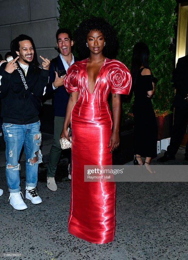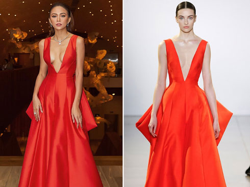 Justine Skye (ngoài cùng bên trái) diện mẫu đầm màu đỏ ấn tượng của NTK Công Trí với phần ngực xẻ sâu, tay phồng cách điệu gợi liên tưởng đến những bông hoa hồng, phối cùng trang sức màu bạc và clutch ánh kim sáng màu.