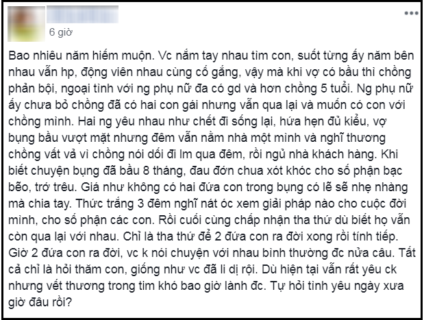 Thức trắng 3 đêm nghĩ nát óc xem giải pháp nào cho cuộc đời mình, cho số phận các con. Rồi cuối cùng chấp nhận tha thứ dù biết họ vẫn còn qua lại với nhau. Chỉ là tha thứ để 2 đứa con ra đời xong rồi tính tiếp. Giờ 2 đứa con ra đời, vợ chồng không nói chuyện với nhau bình thường được nửa câu. Tất cả chỉ là hỏi thăm con, giống như vợ chồng đã li dị rồi. Dù hiện tại vẫn rất yêu chồng nhưng vết thương trong tim khó bao giờ lành được. Tự hỏi tình yêu ngày xưa giờ đâu rồi?"