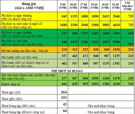 Bảng giá chơi golf tại sân golf Tam Đảo. |