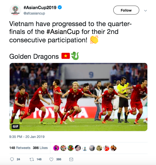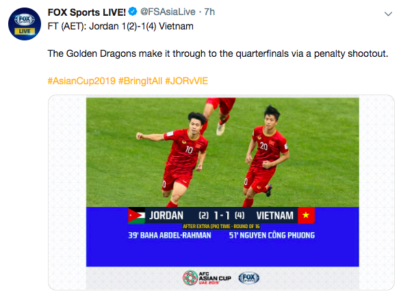 Tài khoản Twitter chính thức của Asian Cup 2019 đăng tải kết quả trận đấu và gọi các cầu thủ Việt Nam là những chú "Rồng Vàng" dũng mãnh