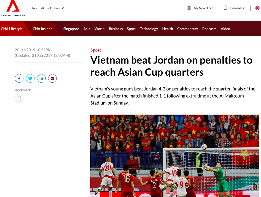 Channel News Asia cũng nhanh chóng đưa tin về chiến thắng của Việt trước đối thủ Jordan
