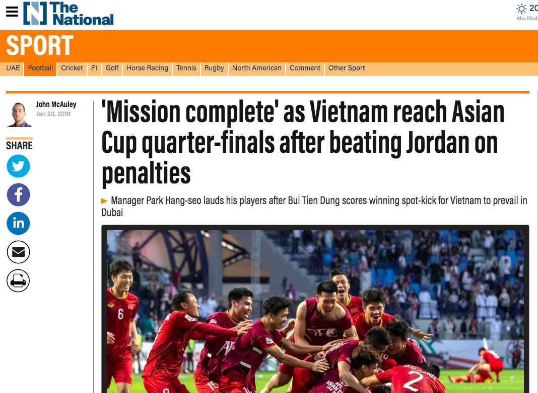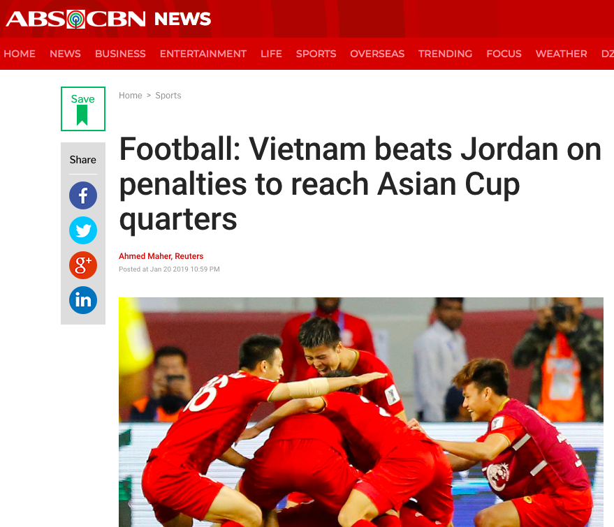 Ngoài ra còn có các trang tin/ mục thể thao trên nhiều báo nước ngoài như: ABS-CBN Philippines, Yahoo hay The National... cũng đồng loạt đưa tin về đại diện duy nhất của khu vực Đông Nam Á ở vòng tứ kết Asian Cup 2019: