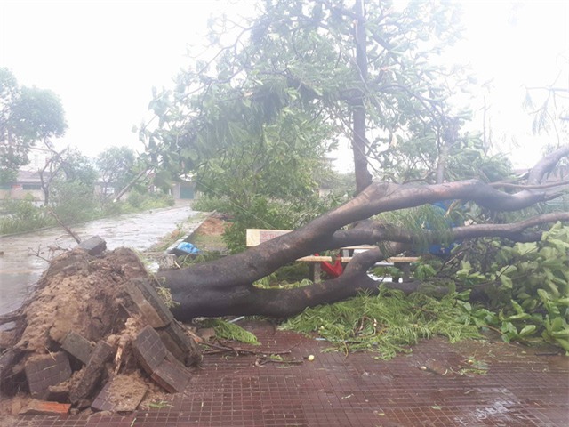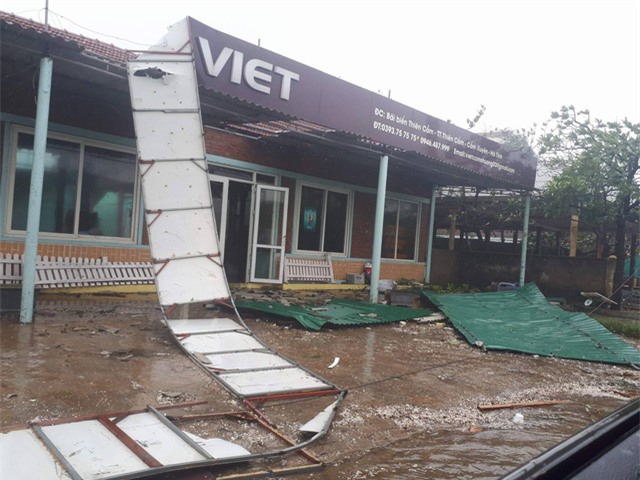 Tại Hà Tĩnh, bãi biển Thiên Cầm bão vẫn đang gào thét mịt mù, cây cối nghiêng ngả, nhiều ngôi nhà bị tốc mái.